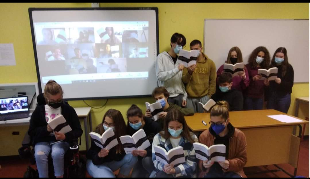 L'immagine che sta in fondo a questo frustolo circola da un paio di giorni nelle reti sociali. Si tratta di una classe, Apollonio non sa di quale scuola, di quale ordine e grado. Studenti e studentesse di tale classe si sono messi e messe in posa, com'è manifesto, per rappresentarsi nell'atto di leggere un libro, lo stesso libro.
